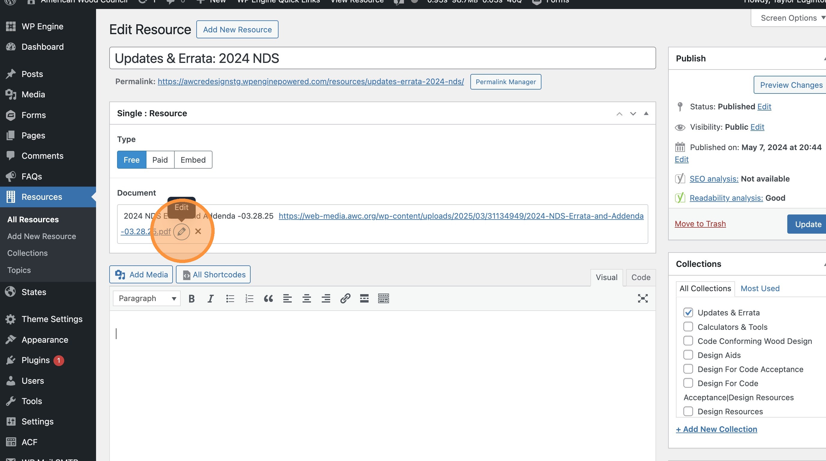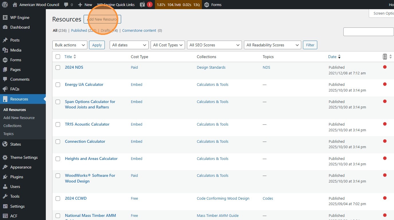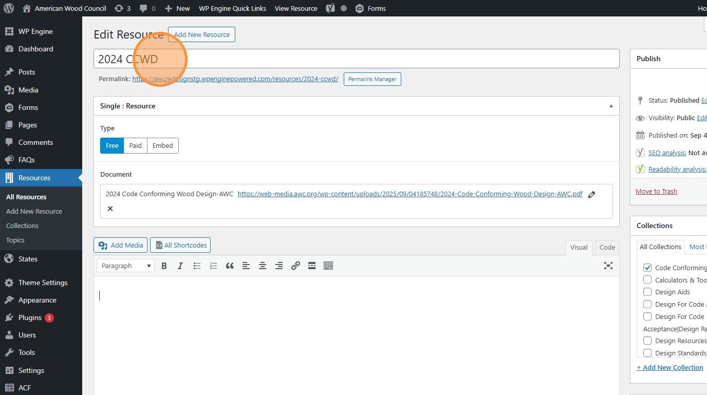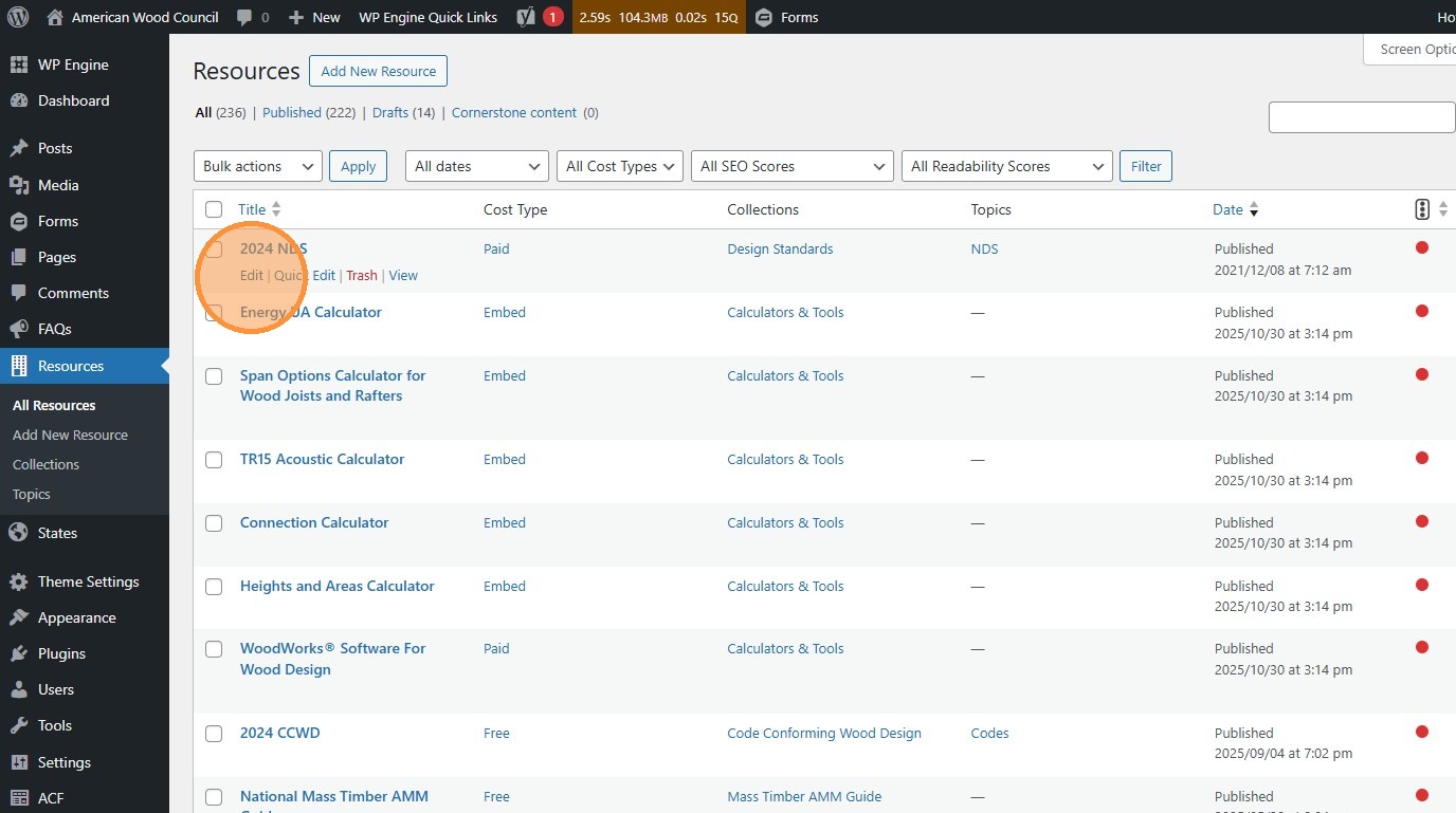 Section titled “1. Navigate to https://awc.org/wp-admin/, and click “Resources”.”This is where you can edit the resources that appear in the Resource Hub.