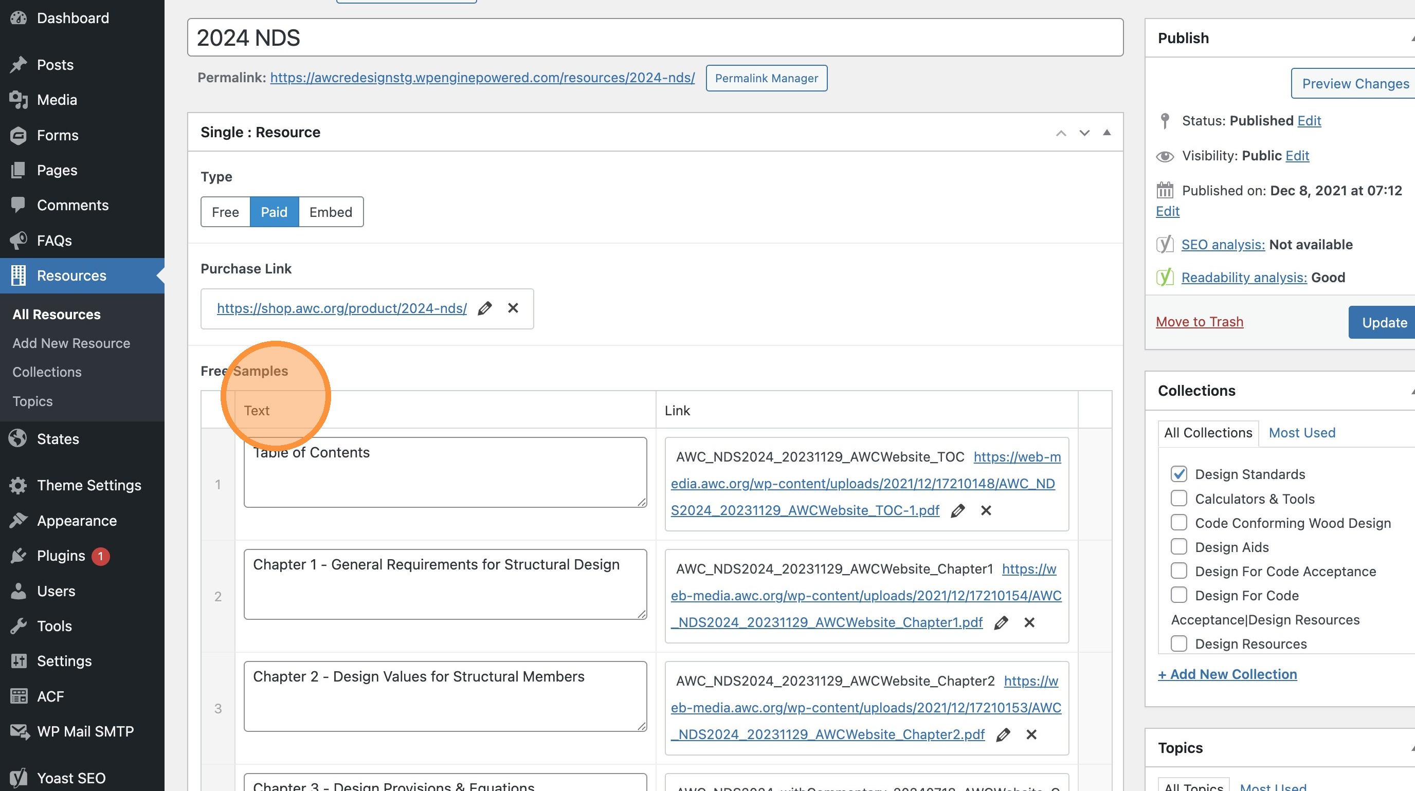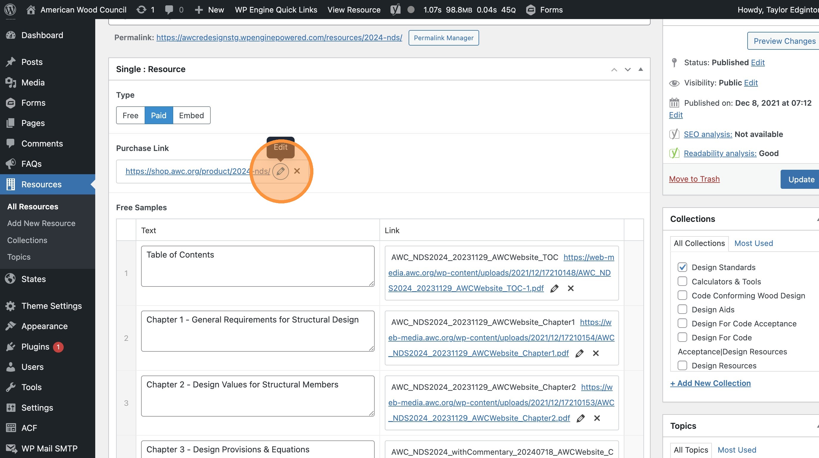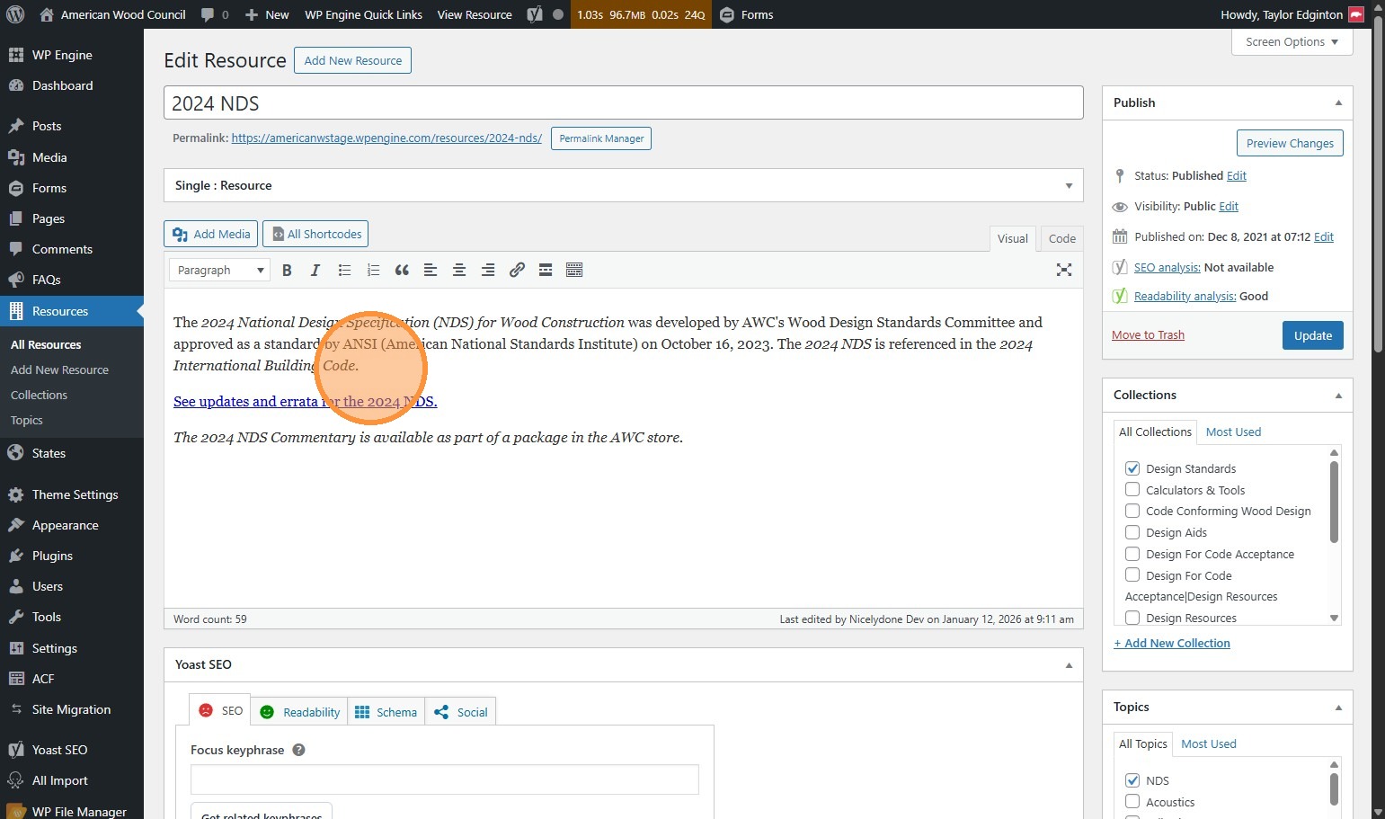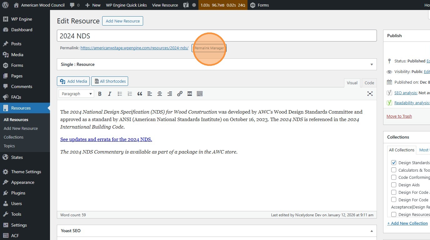 Section titled “1. Navigate to https://awc.org/wp-admin/, and click “Resources”.”This is where you can edit the resources that appear in the Resource Hub.