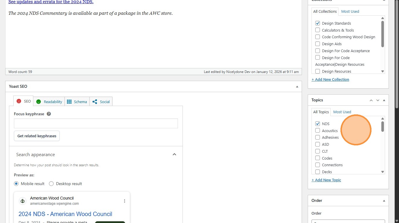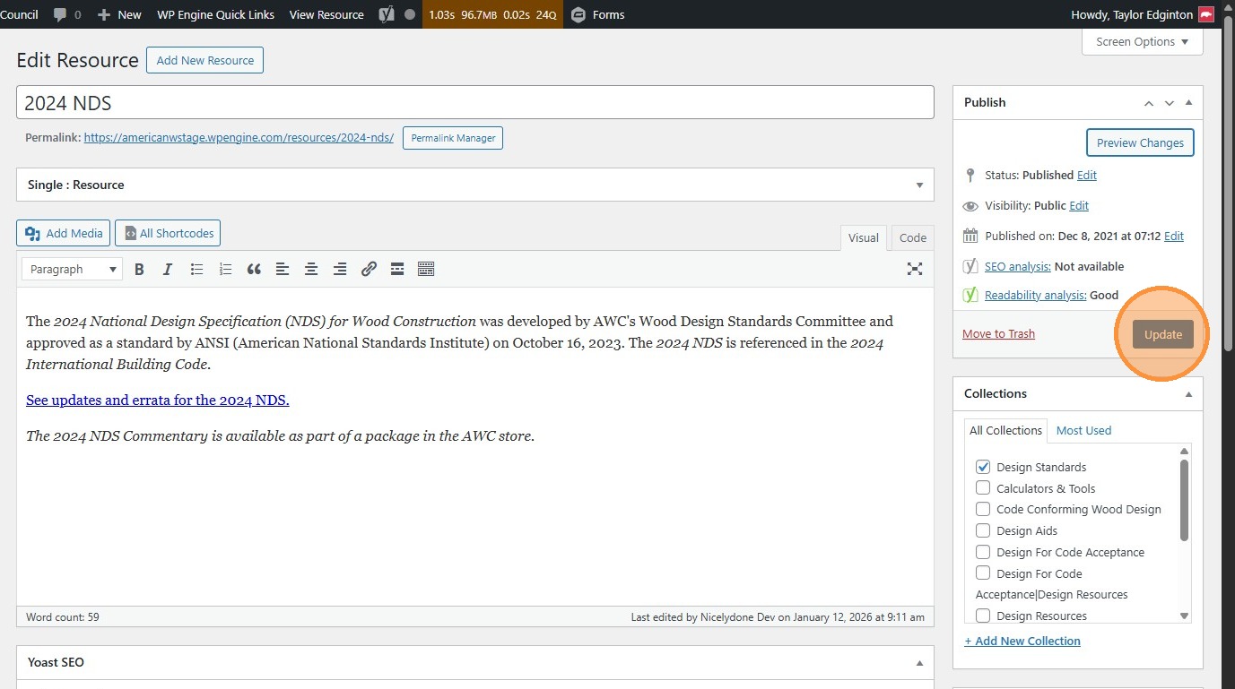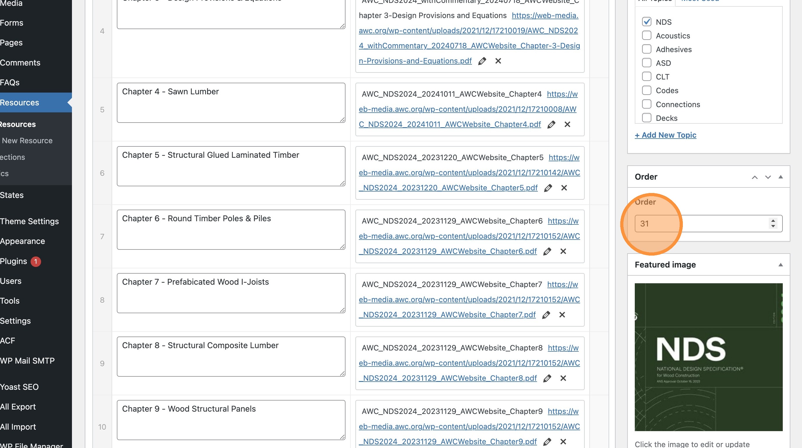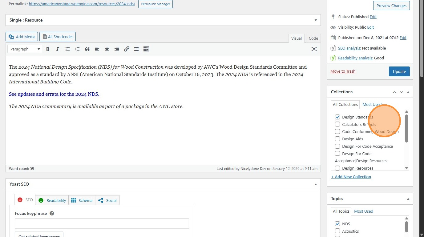Section titled “1. Navigate to https://awc.org/wp-admin/, and click “Resources”.”This is where you can edit the resources that appear in the Resource Hub.