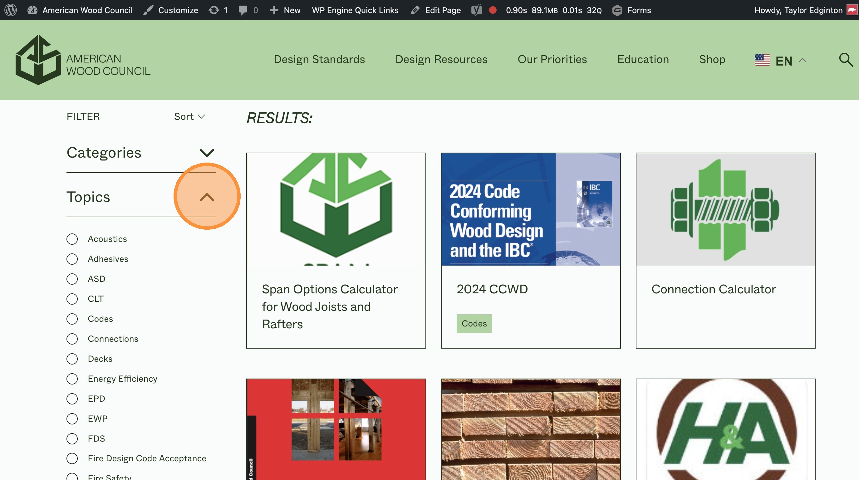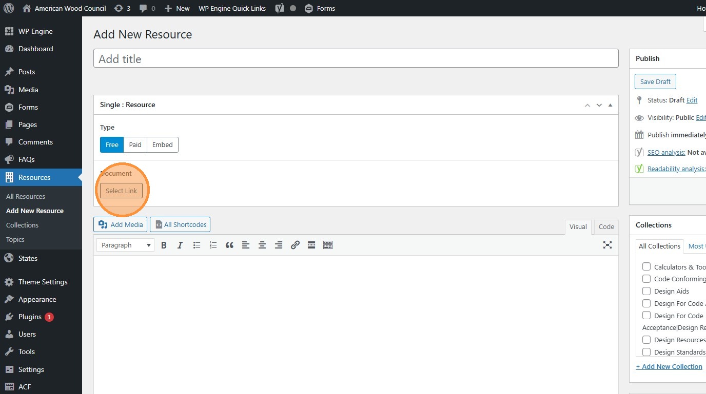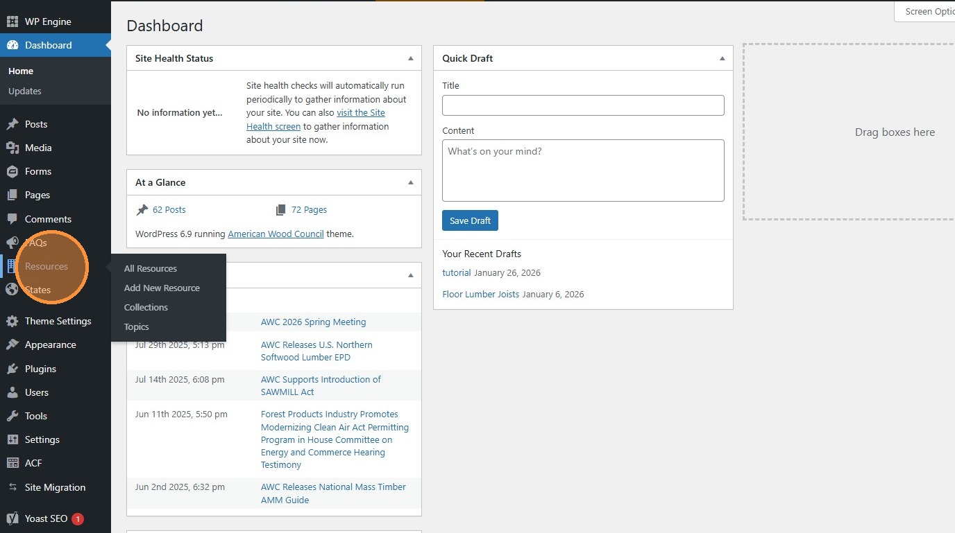 1. Navigate to https://awc.org/wp-admin/, and click “Resources”.